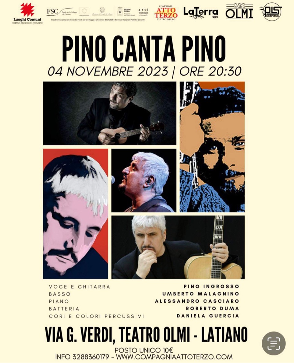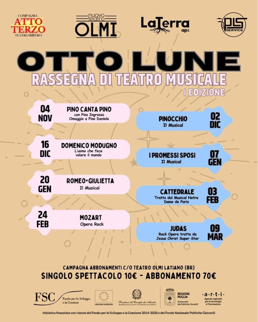 La Compagnia Teatrale Musicale AttoTerzo partner dell’APS La Terra di Latiano vince il Bando Regionale di Gestione del Nuovo Teatro Olmi di Latiano. A tal proposito organizza la prima edizione della Rassegna Teatrale Musicale OTTO LUNE. La Rassegna comprende 8 spettacoli in abbonamento. Apre la stagione lo spettacolo musicale omaggio a Pino Daniele “Pino canta Pino” che si terrà Sabato 4 Novembre al Nuovo